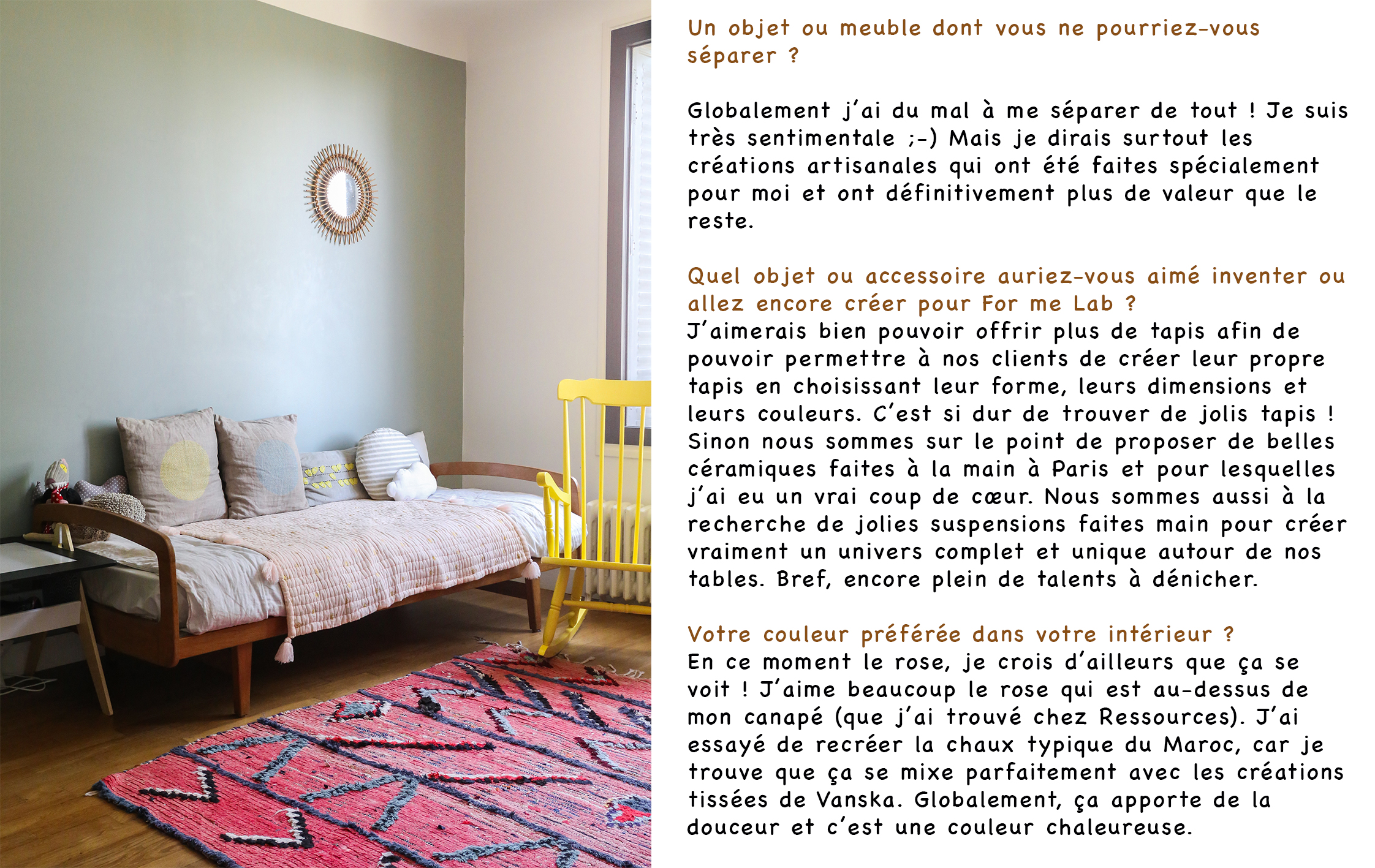 Bonjour ! On démarre la semaine par une visite privée pas comme les autres ! Aujourd’hui on découvre l’intérieur poétique de Geraldine, co-créatrice de For me lab ! Je vous présenterais bien la marque, mais je pense que vous la connaissez déjà, non ? Qui n’a pas remarqué leur joli stand chez Maison&Objet (l’un des plus instagrammables et instagramés pendant l’événement) ou n’a pas encore vu passer des photos pleines d’inspiration des produits partout sur le net ? Voilà, For me lab est bien le premier sélect store de la création artisanale !