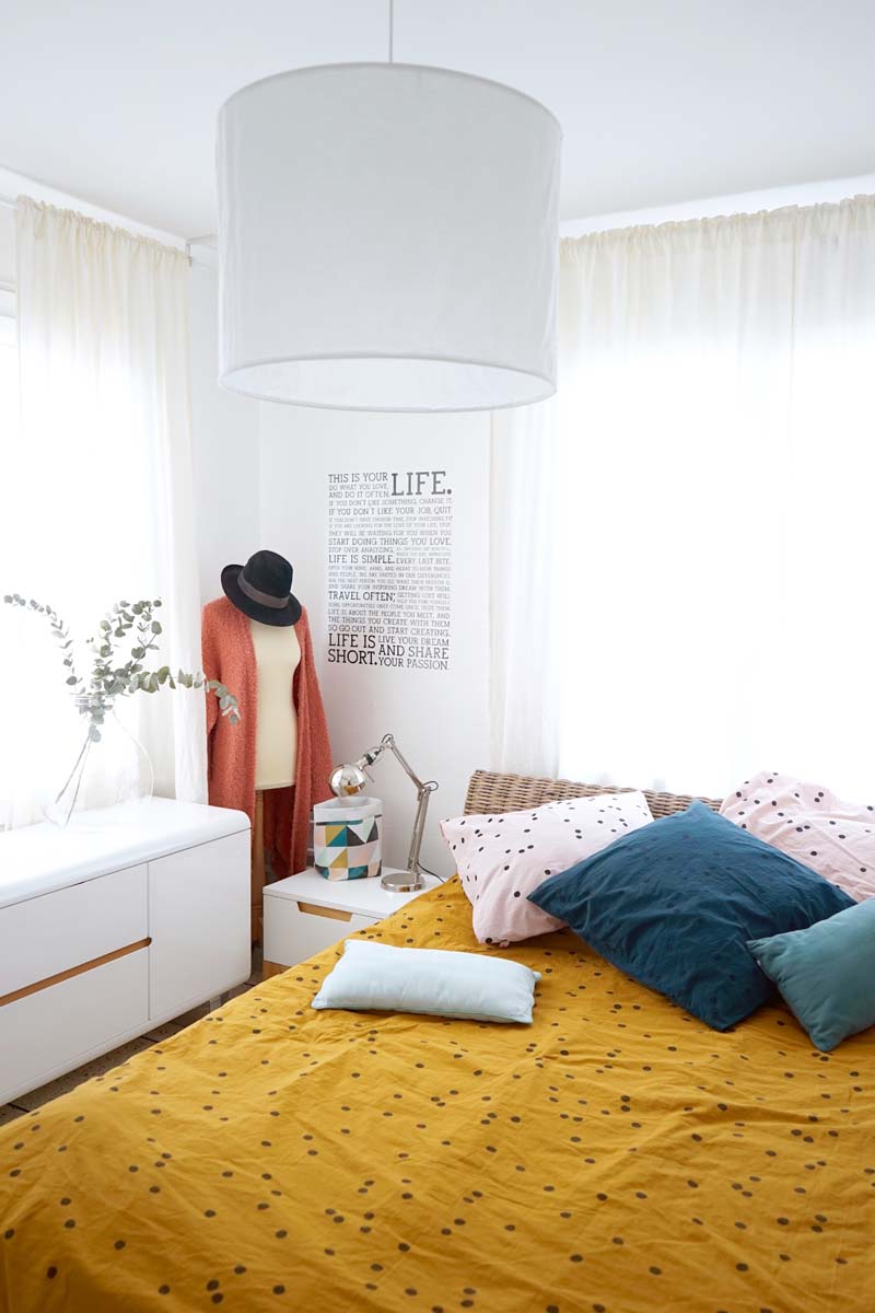 Cette marque a su trouver sa place dans l’univers de la décoration avec ces imprimés craquants, ses couleurs marquantes et sa touche très originale, mais aussi très Happy ! La collection Odette m’a particulièrement séduite avec l’imprimé à poids revisité. Une note d’humeur et une touche ludique qui donnent du peps à la maison. De quoi faire plaisir à toute la famille. Comme tous les tons me plaisaient, j’ai opté pour un mix de couleurs pour casser l’ambiance légèrement monochrome de la chambre. Je n’ai pas besoin d’en rajouter, les images parlent d’elles-mêmes. Voilà les petits détails qui font toute la différence en matière de déco !