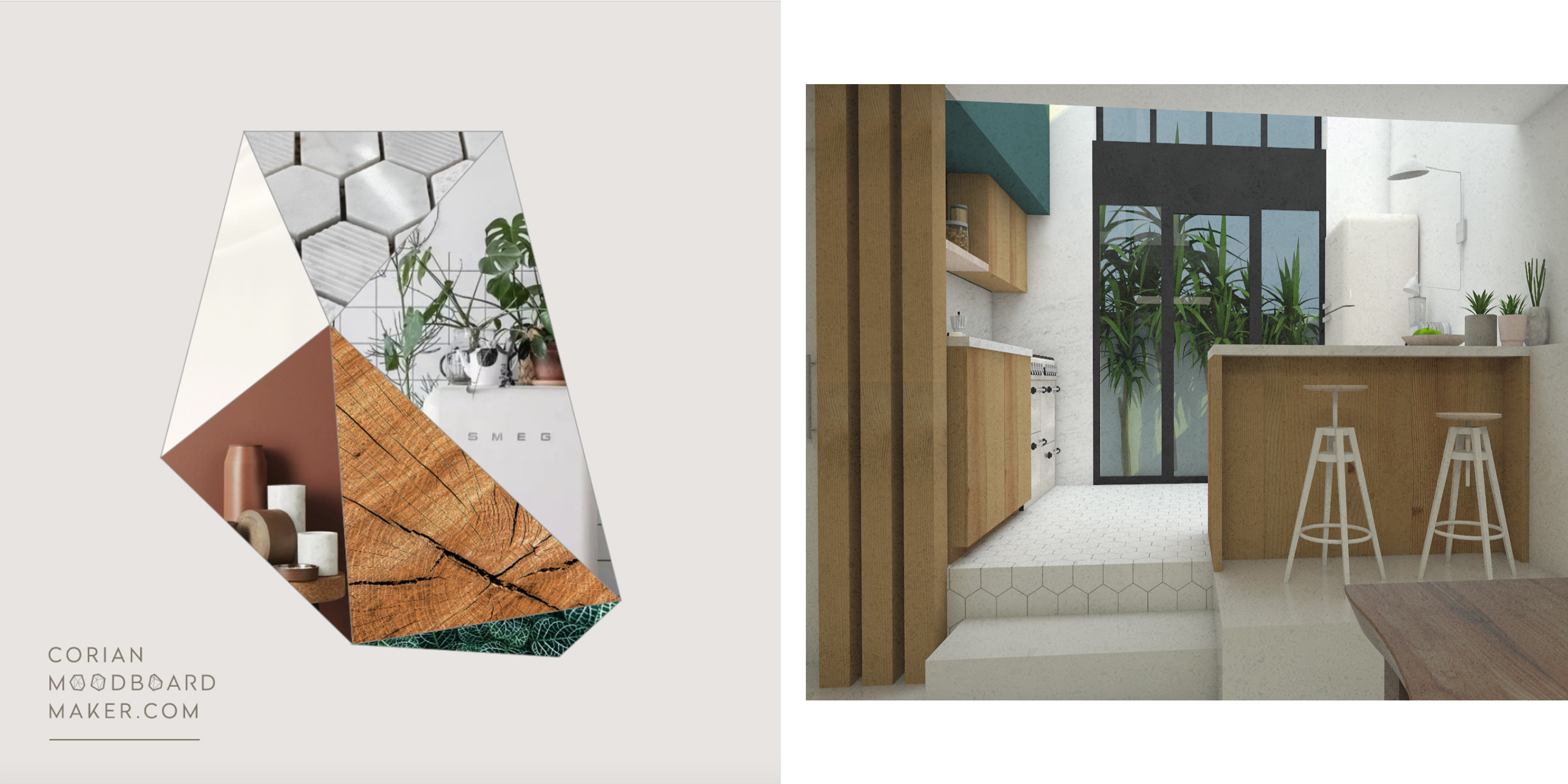 Ensuite, j’ai fait le moodboard de la cuisine avec le Corian® Solid Surface in Verano White et j’ai trouvé le rendu absolument fidèle au projet !