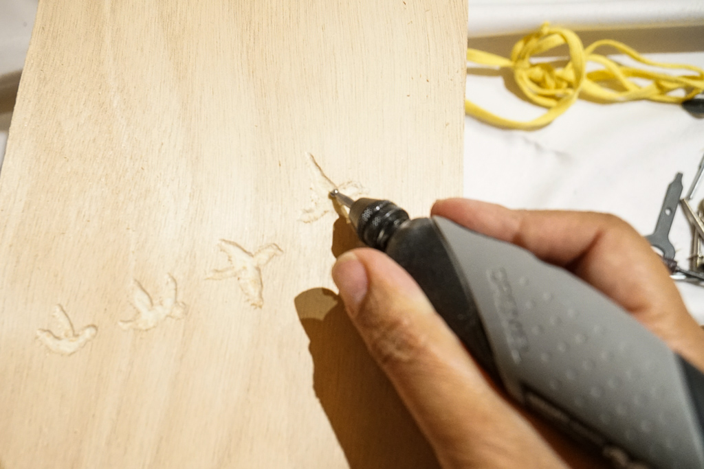 - Ensuite, avec la pointe de gravure pour bois de la machine Dremel passez sur la forme que vous avez dessiné.