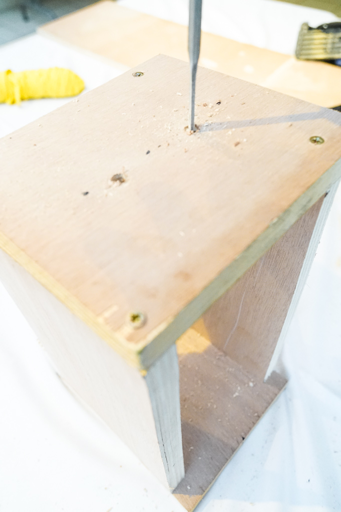 - Percez un trou en plein milieu du support de la maisonnette (devant). Passez-y ensuite une baguette en bois.