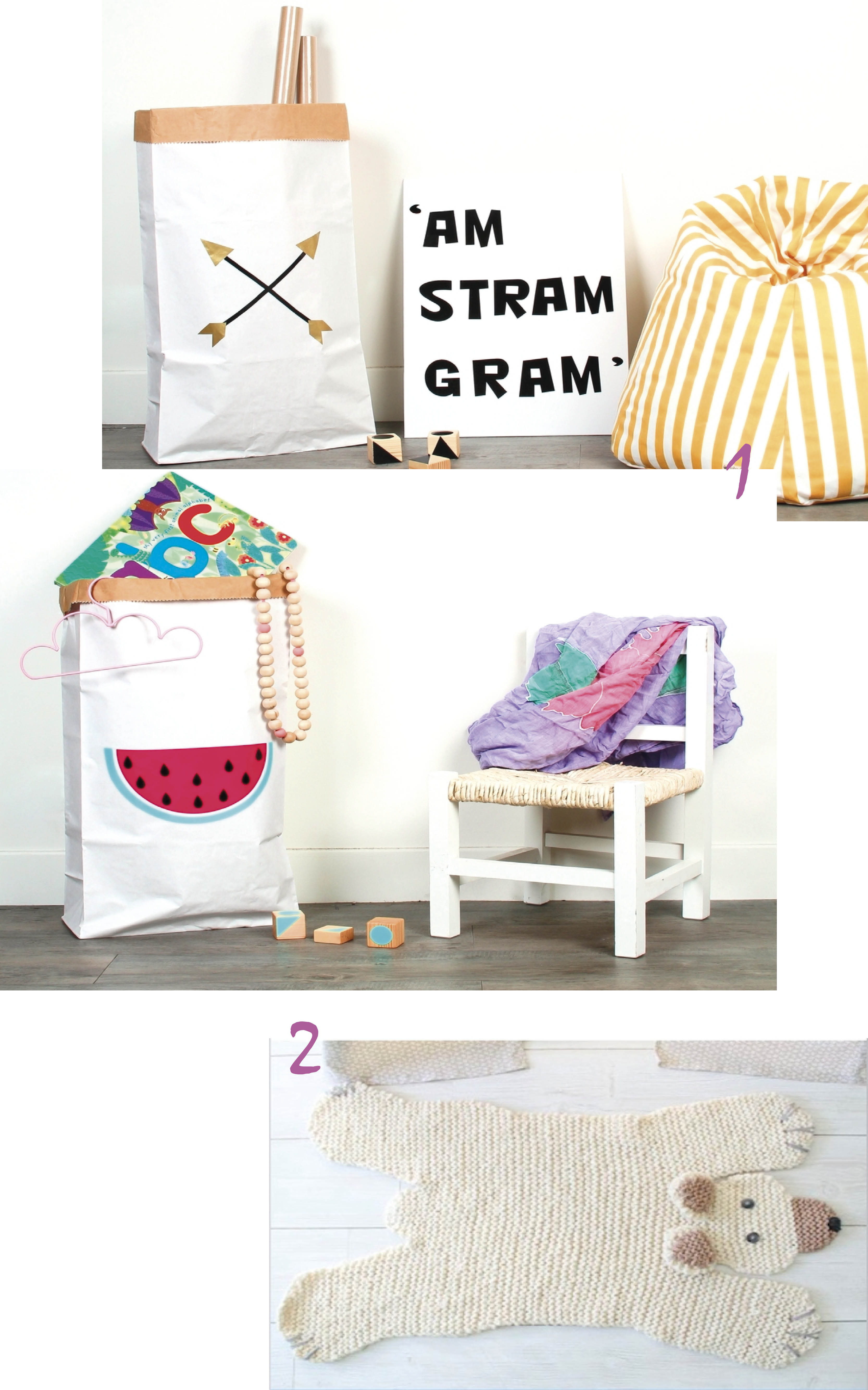 1 – J’aime beaucoup les paperbags, du coup, j’ai tout de suite craqué par ceux de Mon petit Zoréol. Je suis in Love avec le modèle Flèche et son côté bohème, mais j’aime beaucoup aussi le modele pastèque très gaye (et je n’ai même pas cité le sac cactus, oups …) 2 – En navigant sur Etsy, je suis tombée sur ce tapis ourson de Wolverines Knits et j’ai tout de suite eu envie de l’adopter. Il serait si bien dans la chambre de Valentina. So cute !