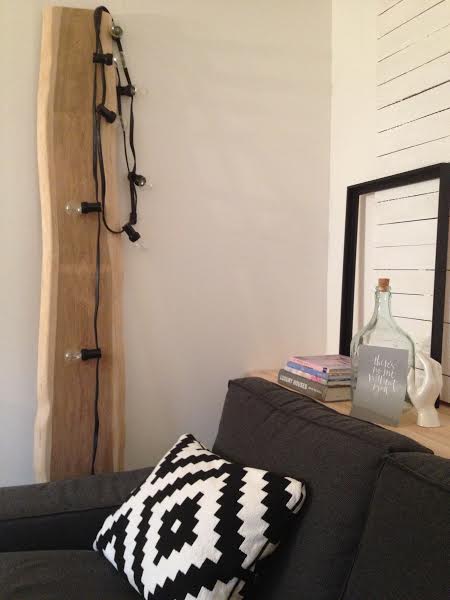 Cette planche rustique fait effet de lampe, entourée de la guirlande Bella vista chez mon amie architecte Fabiane Brandão à Munich. J’adore le format du bois et sa finition. C’est très élégant et moderne comme rendu.