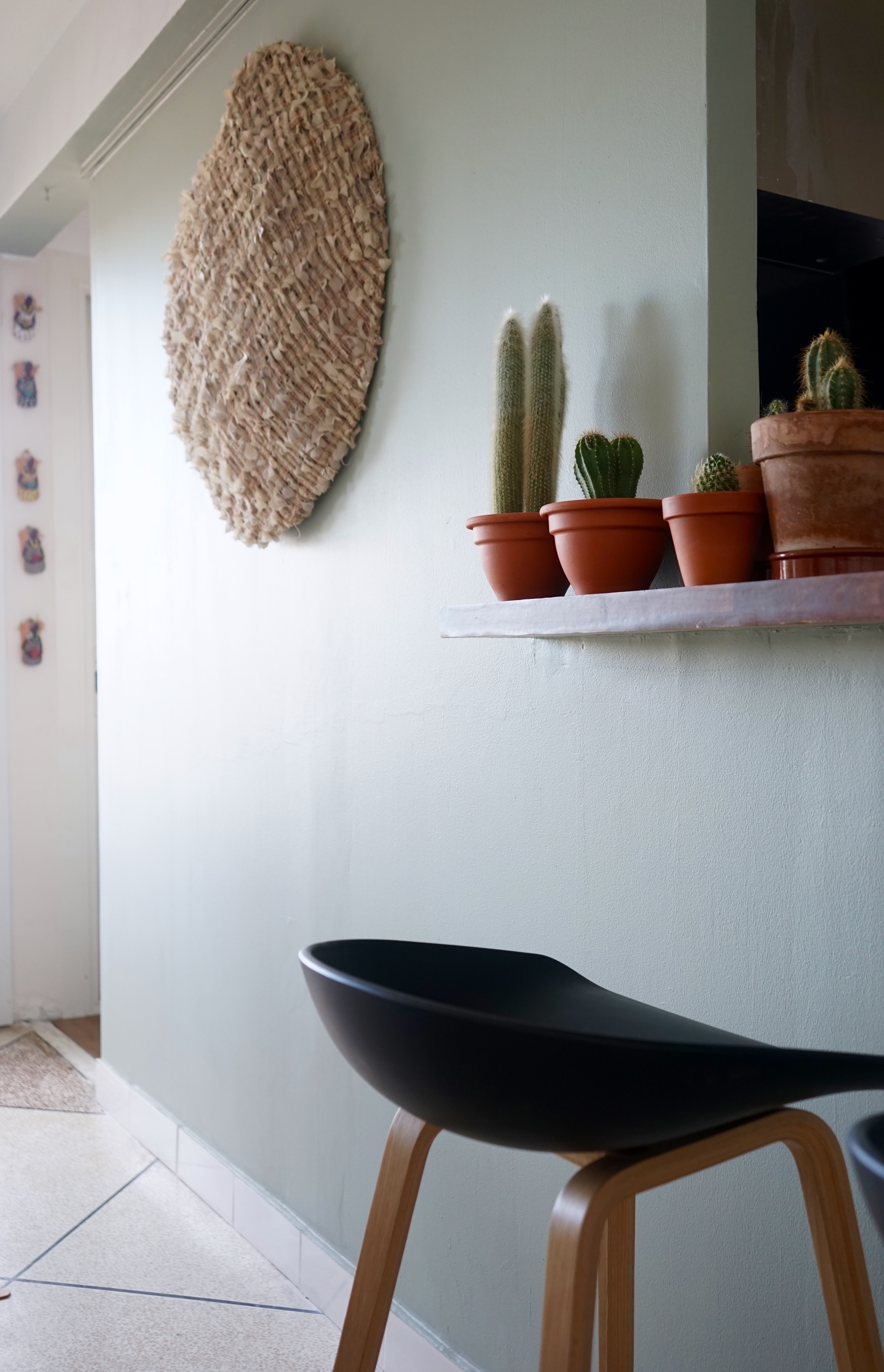 Mais la marque voulait vraiment me faire connaître l’univers d’inspiration de cette nouvelle ligne, synonyme de grande créativité et d’esthétisme : celui de la haute couture et son expertise couleur. On m’a proposé alors le choix d’une deuxième couleur en plus du blanc. Quand j’ai regardé les tonalités proposées dans le catalogue parmi les 4 collections pleines de tentes élégantes et exclusives – Glamour, Romantic, Modern et Sauvage – j’ai tout de suite craqué par le vert-de-gris de la dernière avec sa touche ethnique-chic.Mon_nouveau_mur_vert_de_gris_blog_DECOuvrir_designMais question pratique. Sur quel mur la mettre. Et là, pas de doute, notre vieux mur noir de la salle à manger qui nous accompagnait depuis les 6 dernières années allait prendre sa retraite. En fait, avec le temps, je me suis délaissé un peu des décors trop monochromes, très noir et blanc et de l’effet scandinave à fond. Même si j’aime encore et toujours ce style intemporel, je m’accroche de plus en plus aux ambiances bohèmes et ethniques, aux touches plus naturelles et aux mélanges de couleurs. Et vous le savez très bien, j’adore le vert. C’est ne pas par hasard que je l’ai par petites touches partout dans la maison !Mon_nouveau_mur_vert_de_gris_blog_DECOuvrir_designEn plus, comme une grande envie de fraîcheur, de nature et de dépaysement, j’ai commencé à faire rentrer chez moi des plantes, des macramés, des éléments en bois. Des objets artisanaux, faites-mains dénichés auprès des créateurs, mais aussi lointains ramenés des voyages et même de mon pays natal, le Brésil. Alors, jouer la touche de couleur sur ce mur est devenue une évidence. Surtout une nuance assez végétale. YOUPIII !