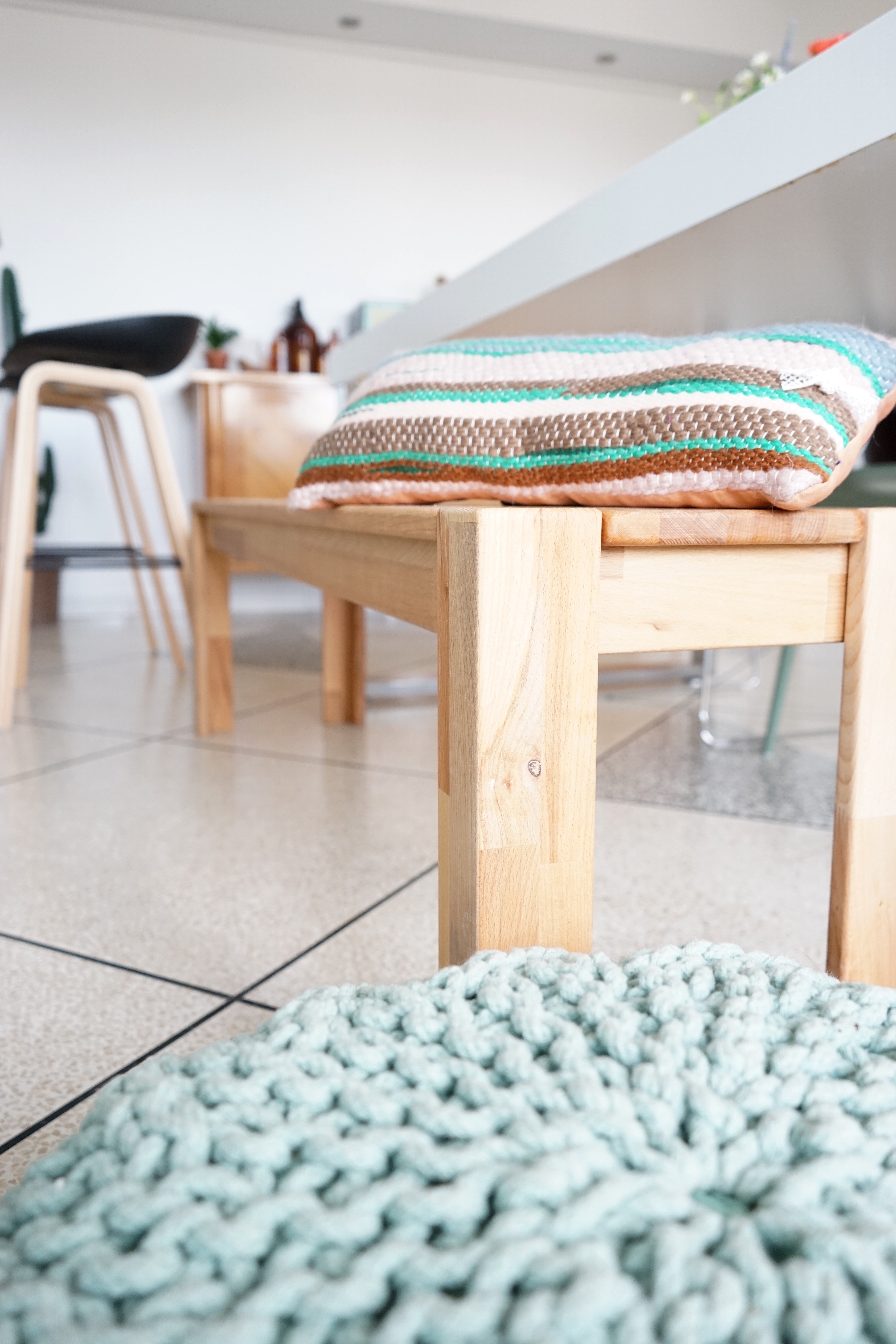 Et je ne sais pas si vous avez remarqué, mais avec la nouvelle peinture, d’autres jolis nouveautés ont fait leur rentré dans la maison pour s’accorder à cet univers verdâtre : une lune en macramé entièrement faite-main par des artisans brésiliens, un paper bag DIY réalisé par Nathalie du joli blog Regards et Maisons spécialement pour ma petite Valentina, le vase Bloomingville, une des belles trouvailles à dénicher sur le E-shop Cleo sur la Toile, un site complétement dans mon esprit vacances dont je vous parlerais bientôt et le coussin tricoté à main par les créatrices de Bohometrie sur mesure pour moi.