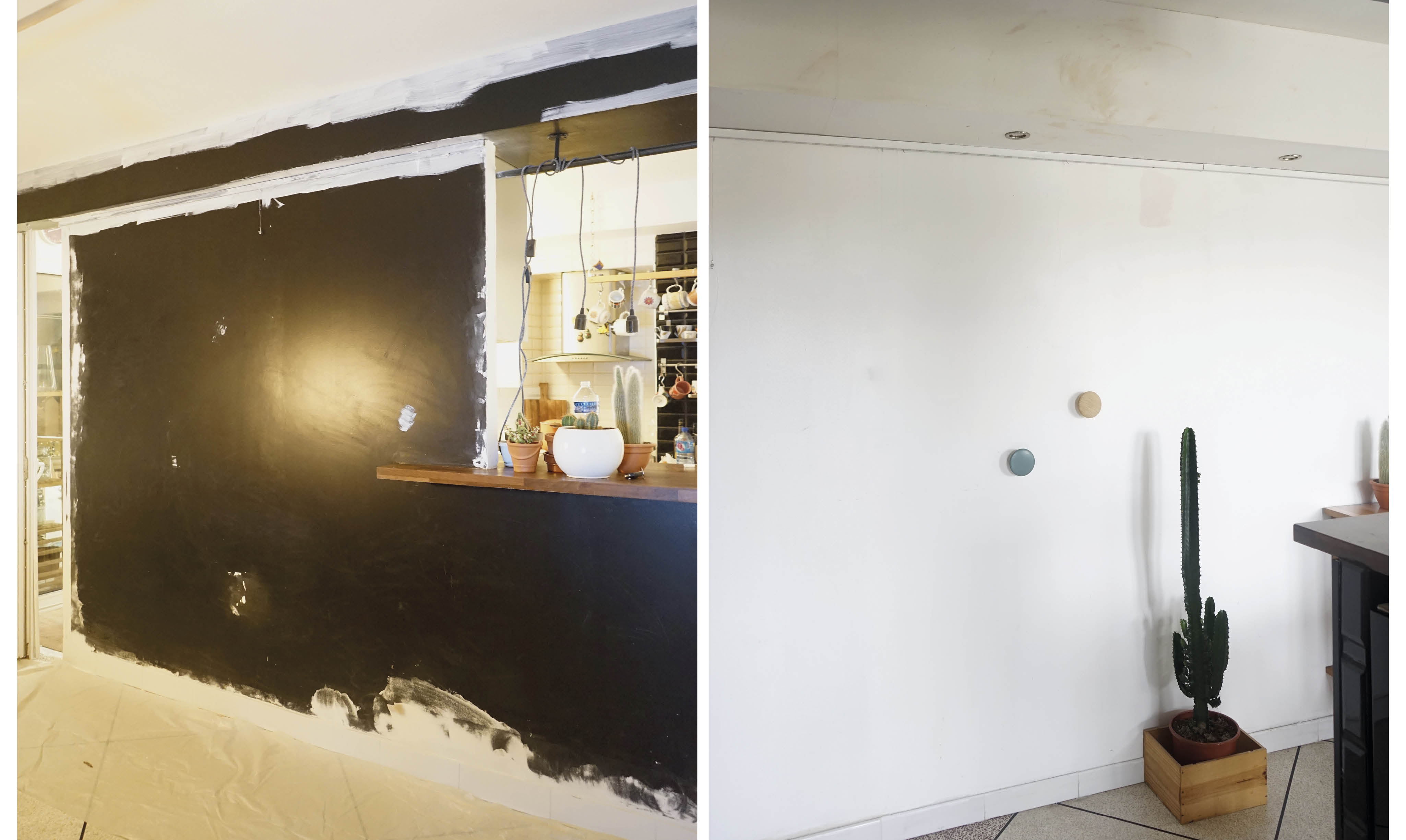 Et parmi les dernières transformations, c’est notre mur noir qu’à fait ses adieux.Mon_nouveau_mur_vert_de_gris_blog_DECOuvrir_designL’idée est parti d’un échange réalisé avec Valentine Dulux qui m’avait proposé de devenir ambassadrice de la marque en testant un des coloris de sa nouvelle ligne Dulux Valentine COUTURE. À vrai dire, on comptait déjà rependre en blanc le mur de l’entrée que traverse le séjour vers le couloir, car il était très taché et jauni. Faute d’une vieille et mauvaise peinture (raison de plus d’en choisir une qualitative cette fois-ci).