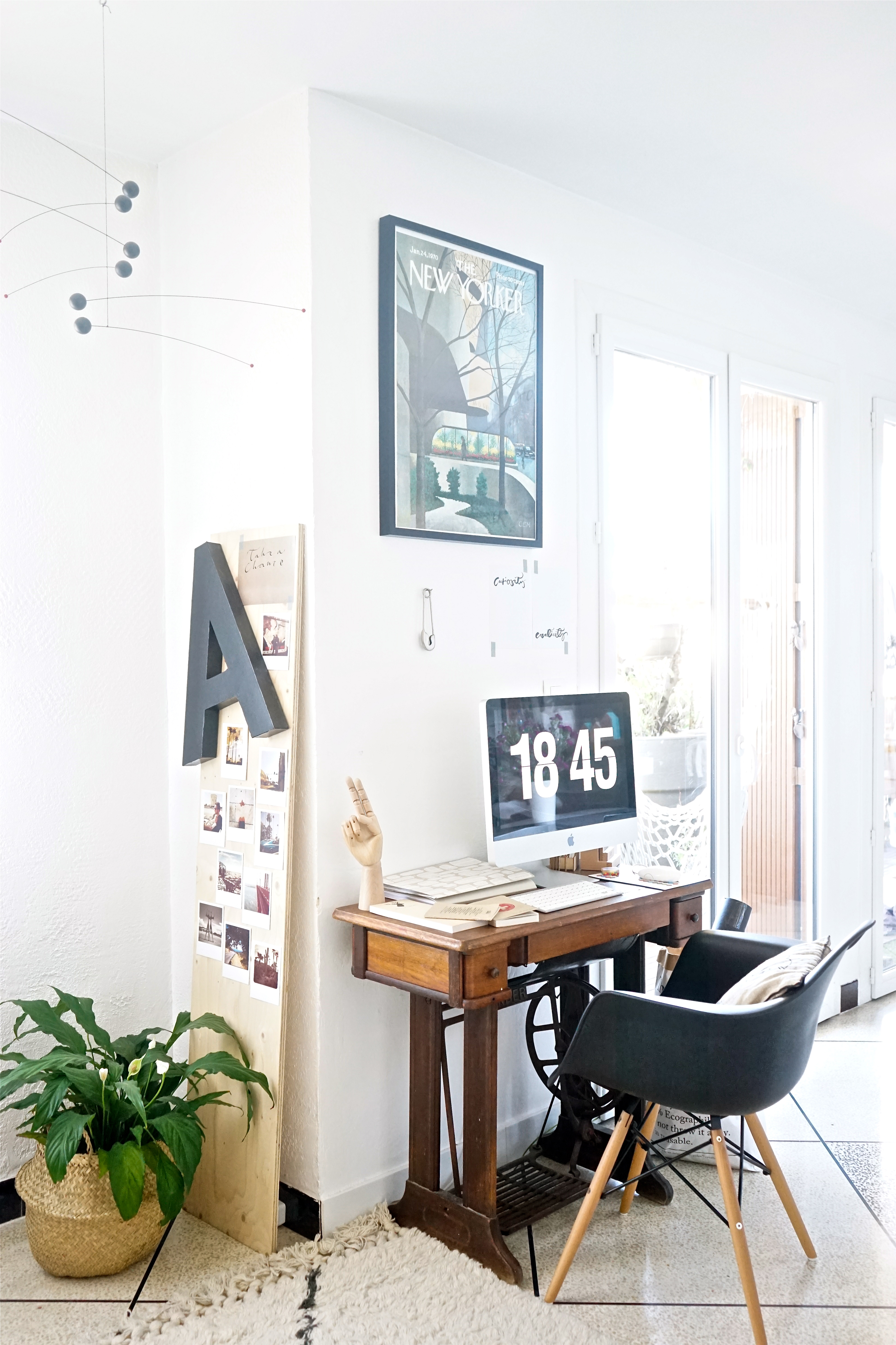 Pour le fondre dans le décor, je l’ai tout simplement intégré dans l’ambiance : les mêmes couleurs et les mêmes lignes du séjour. Comme j’adore mélanger mobilier vintage et déco contemporaine, j’ai profité pour donner une seconde vie à mon ancienne table machine à coudre Singer. En plus, elle habille parfaitement le mur étroit ! De la simplicité, du noir et blanc et quelques éléments comme la chaise Eames, des affiches Ylva Skarp et le sac “paper bag” (parfait pour cacher les papiers et dossiers).