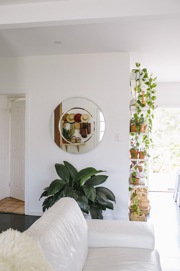 Sans compter les accessoires qui rendent cet intérieur unique et si charmant comme l’accumulation de paniers en rotin ou le grand miroir rond présent dans le séjour.