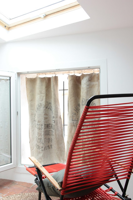Nathalie l’appelle “la petite maison de vacances”, mais moi, je préfère carrément la jolie maison de vacances ! Parce que ce lieu n’est pas décoré avec les vieux meubles de la maison, ni laissé dans son jus tout simplement. C’est quand même un intérieur chaleureux fait avec goût et personnalité. Nathalie s’est investi à fond. Elle a mis son temps, son énergie et a puisé son inspiration dans chaque coin. il n’y a pas mal d’idées à piquer, des petits DIY par ci et par là comme le rideau fait avec des anciens sacs de jute de café, ou l’étagère balançoire dans le salon, le mobilier récupéré et customisé comme les armoires industrielles repeintes en bleu et vert dans une des chambres.