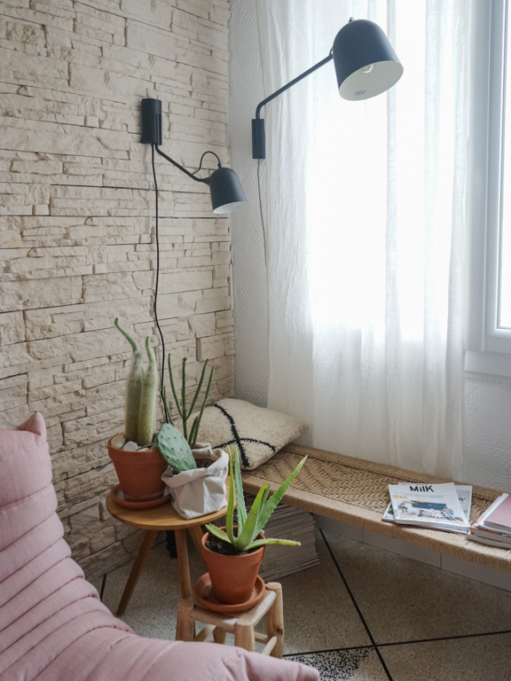Notre pièce à vivre est vraiment l’endroit à la maison dont on passe plus de temps. On fait un peu notre vie entre la cuisine mi-ouverte, le séjour, la salle à manger et le balcon. La mini y joue, j’y travaille, on y écoute de la musique, on y voit des séries sur Netflix, on y lit … Et finalement, ça me manquait beaucoup un éclairage orientable à côté du canapé, côté fenêtre, mais aussi dans notre coin lecture. Pour pouvoir diriger la lumière là nous faut.