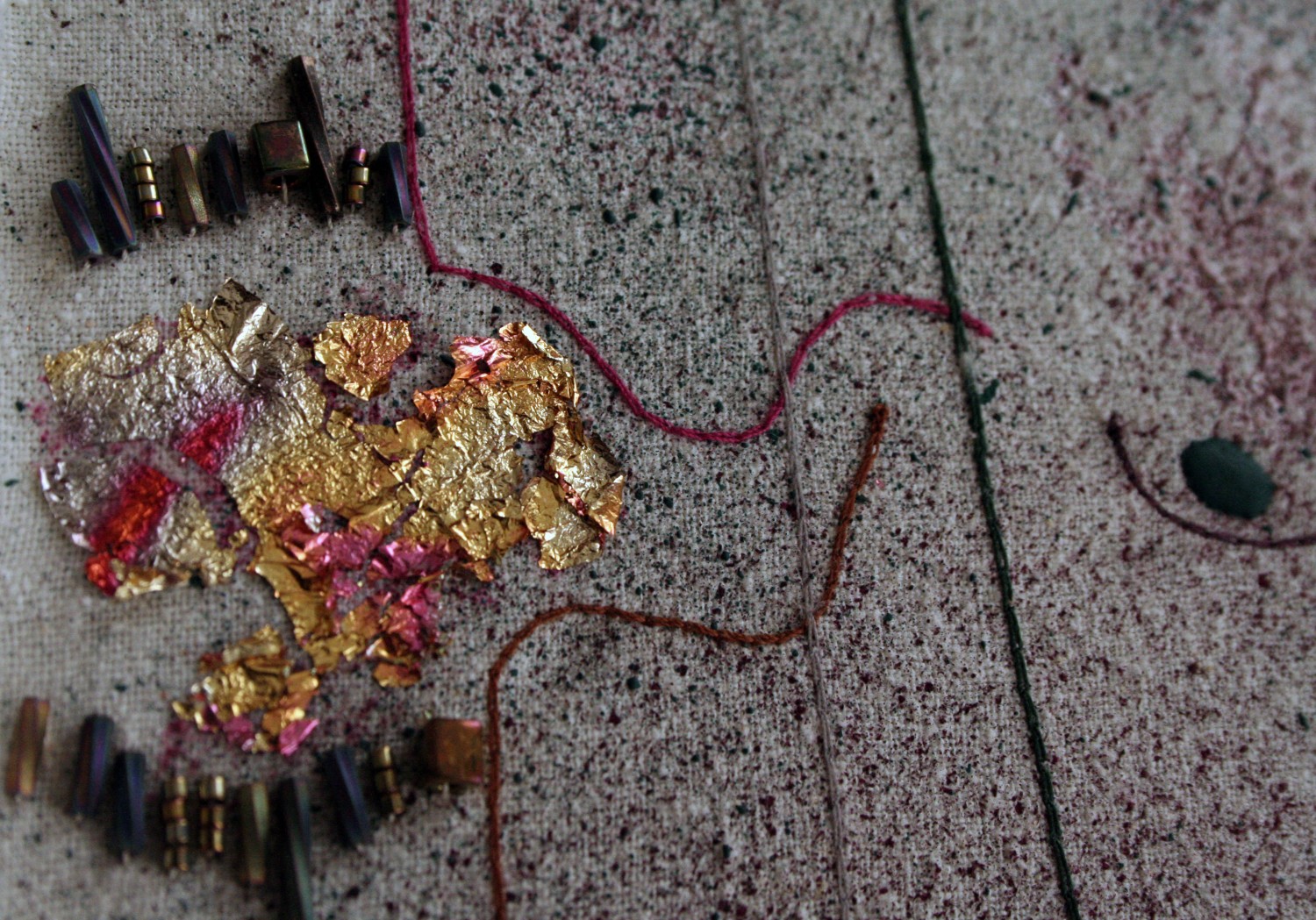 Selon l’artiste, la matière gagne une nouvelle vie grâce à des teintures artisanales, du thermoformage et d’autres techniques comme la pyrogravure sur cuir, le feutrage et même l’impression numérique. Lors de la visite de son atelier, elle nous a montré l’effet tie-dye de la soie imprimé sur du cuir pour l’un de ses projets. SUBLIME ! Après, c’est sur son métier à broder, à l’ancienne, qu’elle associe paillettes, cannetilles (broderie Or), perles et pierres jusqu’à sortir des textiles hors norme. Voilà sa touche personnelle, son vrai savoir faire !