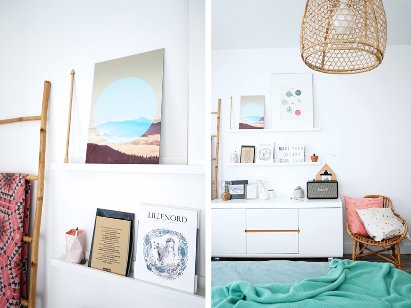 Je penche un peu pour le style bohème chic en ce moment, c’est vrai. Je trouve que dans la chambre, il n’offre pas un rendu très estival. Au contraire, associé à d’autres éléments plutôt “nordiques” il apporte une note chaleureuse et cosy, très bienvenue pour les nuits fraîches. L’astuce est de mixer matières et couleurs pour obtenir l’effet souhaité. Pour cet hiver, j’ai opté pour le vert et le bleu avec quelques touches de rose. Les vents de la mer du nord soufflent par ici. Mais un jaune moutarde marcherait bien aussi. Huuuuum ! ça me donne des idées !