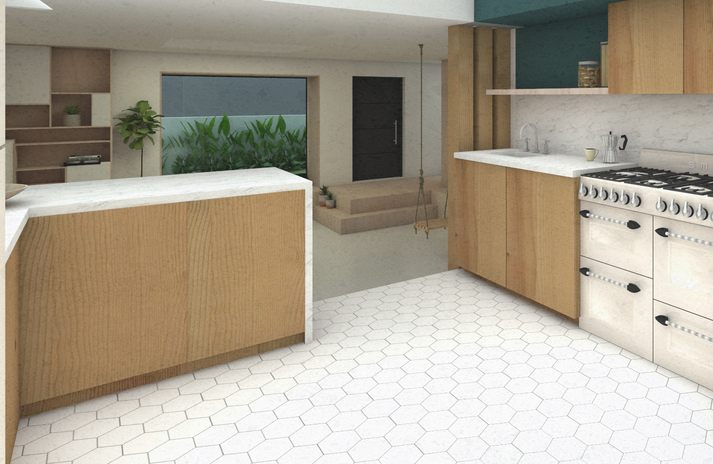 Pour le revêtement de sol, j’ai craqué par un modèle de carrelage hexagonal déniché dans le showroom VOLUM à Montpellier. Ce lieu rempli de belles inspirations réunit des revêtements de sol et de mur assez uniques ainsi que de produits déco pour la maison. Déjà, c’est un lieu exceptionnel avec une mise en scène de produits qui me donne toujours envie de tout acheter. Comme je voulais rester sur la touche du sur-mesure, c’était l’occasion d’y aller faire un tour. J’adore l’idée de démarquer la cuisine par un revêtement différent du reste de la maison. J’ai l’impression que ça donne du cachet, la met en valeur et marque cet espace convivial.